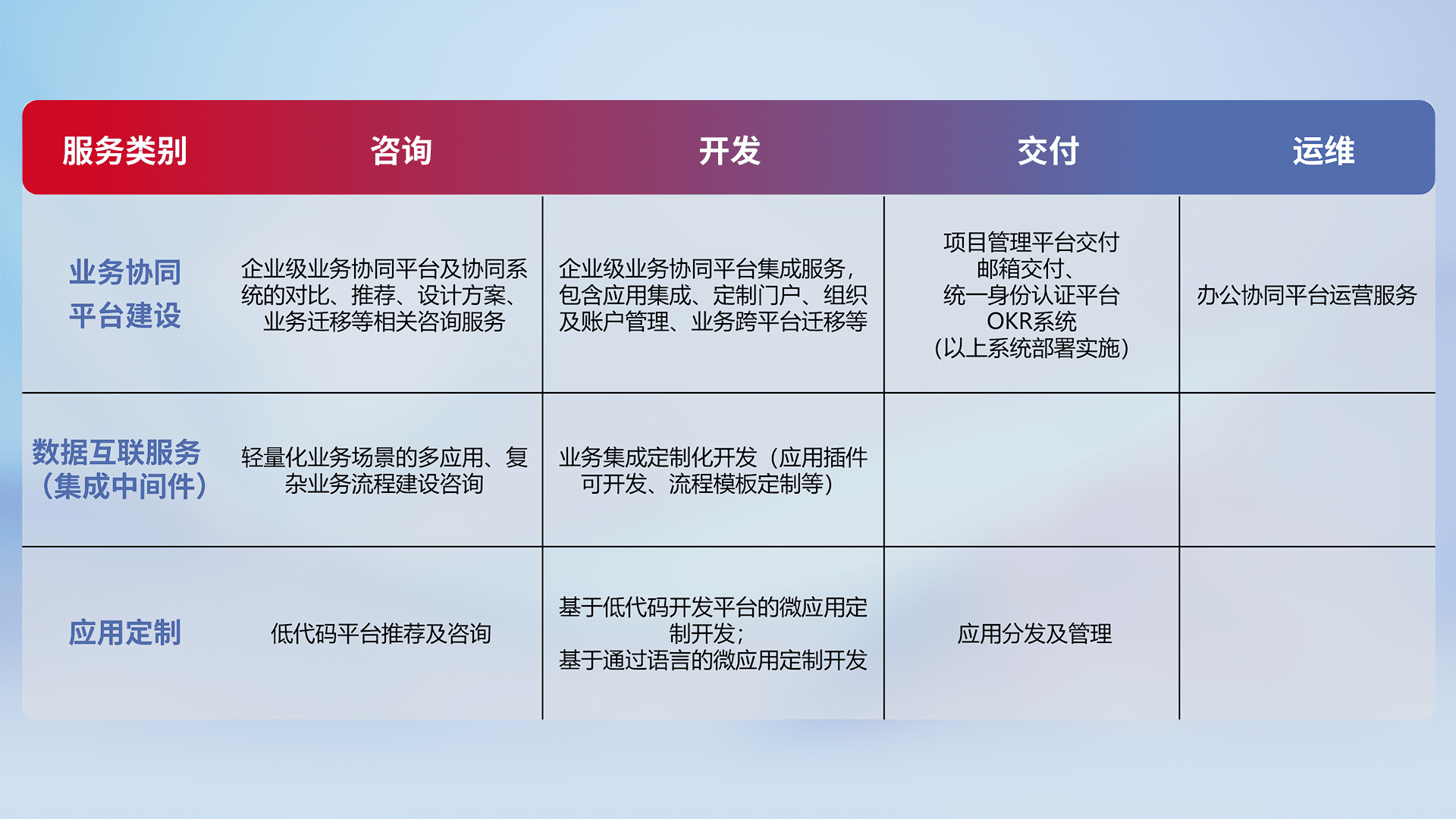 针对钉钉、、、企微、、IDaas等平台级产品提供产品的规划、、、、方案、、、、交付、、定制化开发等服务,,实现如统一协同办公、、、、智能客户服务、、、混合会议管理、、智能数据查询、、、等业务场景,,实现数字化转型。。。